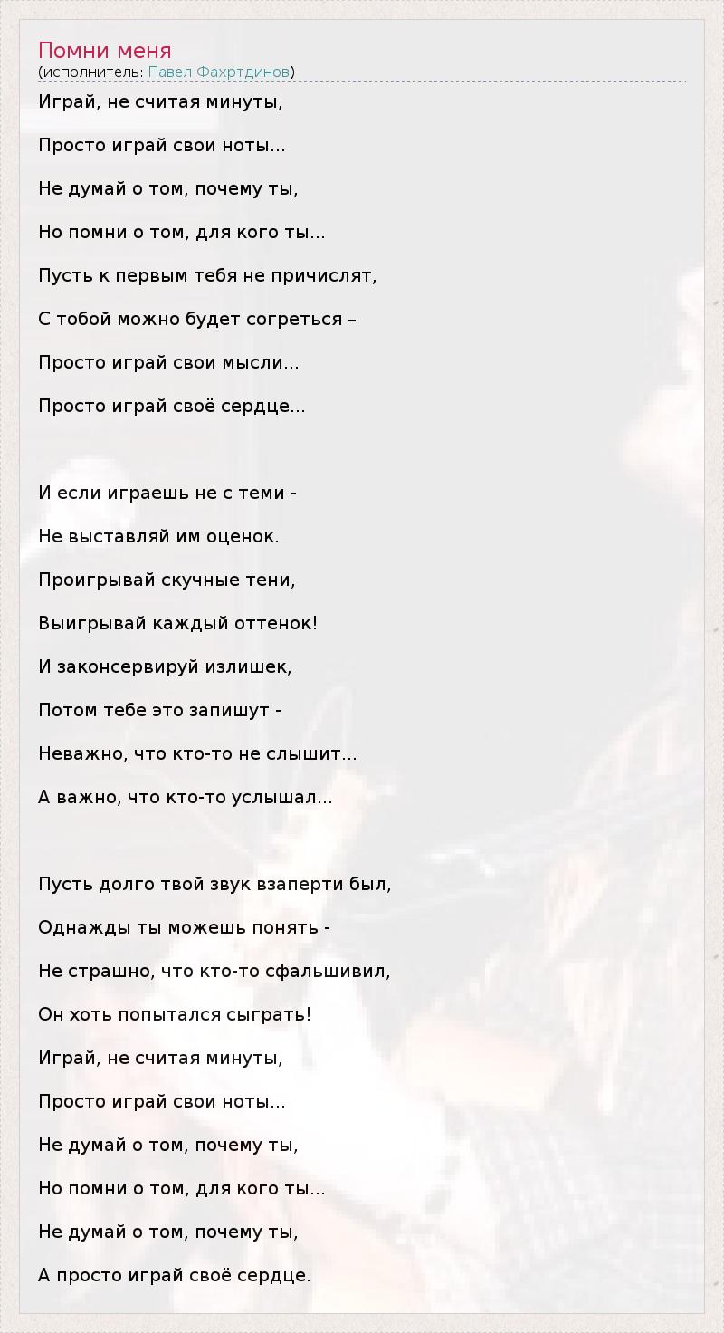 Играй, не считая минуты, Просто играй свои ноты... Не думай о том, почему ты, Но помни о том, для кого ты... Пусть к первым тебя не причислят, С тобой можно будет согреться – Просто играй свои мысли... Просто играй своё сердце... И если играешь не с теми - Не выставляй им оценок. Проигрывай скучные тени, Выигрывай каждый оттенок! И законсервируй излишек, Потом тебе это запишут - Неважно, что кто-то не слышит... А важно, что кто-то услышал... Пусть долго твой звук взаперти был, Однажды ты можешь понять - Не страшно, что кто-то сфальшивил, Он хоть попытался сыграть! Играй, не считая минуты, Просто играй свои ноты... Не думай о том, почему ты, Но помни о том, для кого ты... Не думай о том, почему ты, А просто играй своё сердце.