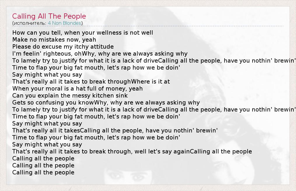 How can you tell, when your wellness is not well Make no mistakes now, yeah Please do excuse my itchy attitude I'm feelin' righteous, ohWhy, why are we always asking why To lamely try to justify for what it is a lack of driveCalling all the people, have you nothin' brewin' Time to flap your big fat mouth, let's rap how we be doin' Say might what you say That's really all it takes to break throughWhere is it at When your moral is a hat full of money, yeah Can you explain the messy kitchen sink Gets so confusing you knowWhy, why are we always asking why To lamely try to justify for what it is a lack of driveCalling all the people, have you nothin' brewin' Time to flap your big fat mouth, let's rap how we be doin' Say might what you say That's really all it takesCalling all the people, have you nothin' brewin' Time to flap your big fat mouth, let's rap how we be doin' Say might what you say That's really all it takes to break through, well let's say againCalling all the people Calling all the people Calling all the people Calling all the people