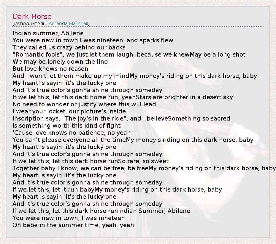 Indian summer, Abilene You were new in town I was nineteen, and sparks flew They called us crazy behind our backs "Romantic fools", we just let them laugh, because we knewMay be a long shot We may be lonely down the line But love knows no reason And I won't let them make up my mindMy money's riding on this dark horse, baby My heart is sayin' it's the lucky one And it's true color's gonna shine through someday If we let this, let this dark horse run, yeahStars are brighter in a desert sky No need to wonder or justify where this will lead I wear your locket, our picture's inside Inscription says, "The joy's in the ride", and I believeSomething so sacred Is something worth this kind of fight 'Cause love knows no patience, no yeah You can't please everyone all the timeMy money's riding on this dark horse, baby My heart is sayin' it's the lucky one And it's true color's gonna shine through someday If we let this, let this dark horse runSo rare, so sweet Together baby I know, we can be free, be freeMy money's riding on this dark horse, baby My heart is sayin' it's the lucky one And it's true color's gonna shine through someday If we let this, let it run babyMy money's riding on this dark horse, baby My heart is sayin' it's the lucky one And it's true color's gonna shine through someday If we let this, let this dark horse runIndian Summer, Abilene You were new in town, I was nineteen Oh babe in the summer time, yeah, yeah