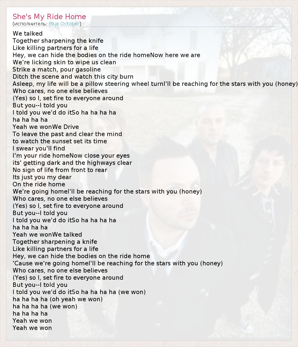 А как ты думаешь, о чем песня "She's My Ride Home" ?
