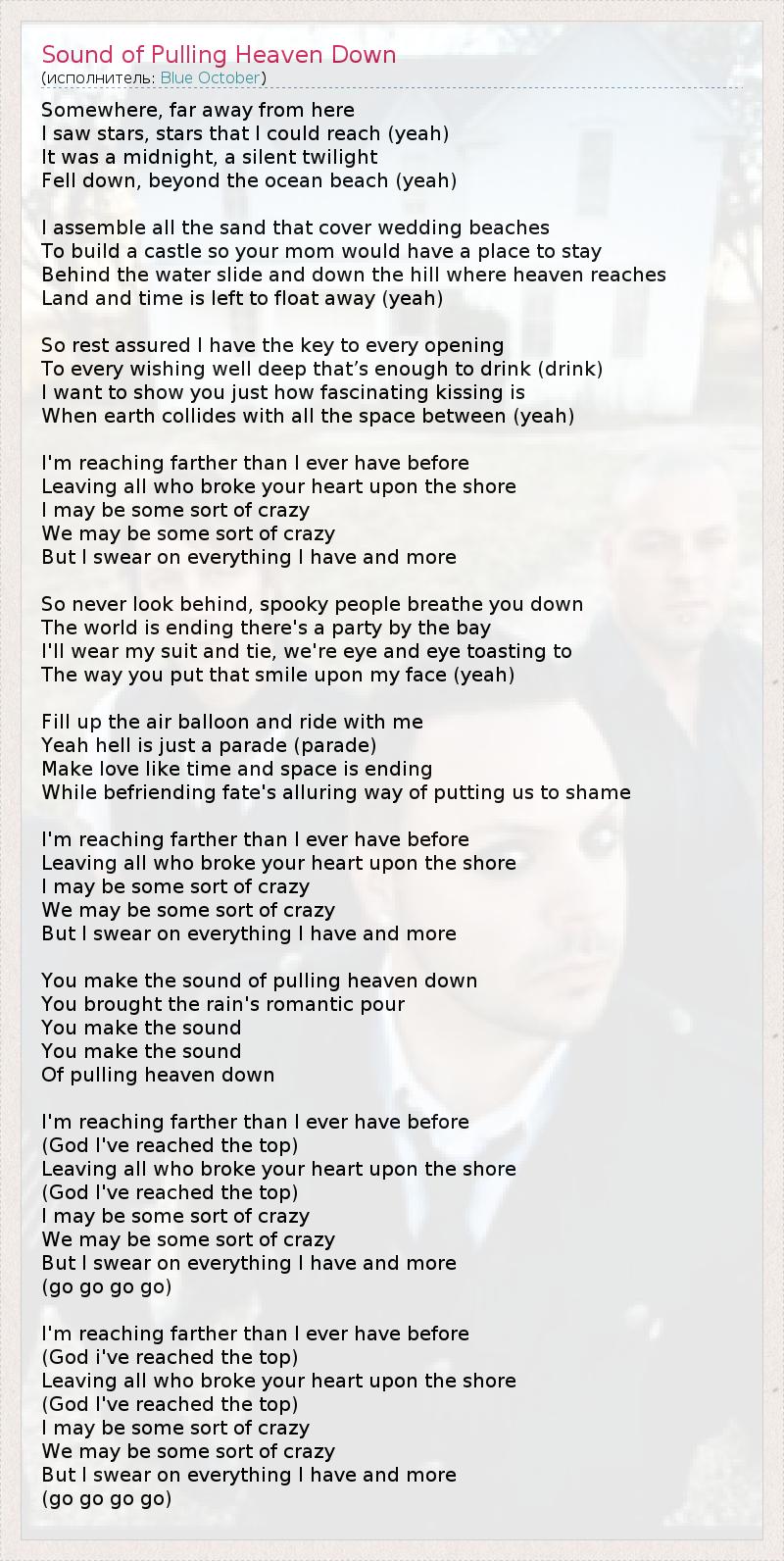 Somewhere, far away from here I saw stars, stars that I could reach (yeah) It was a midnight, a silent twilight Fell down, beyond the ocean beach (yeah) I assemble all the sand that cover wedding beaches To build a castle so your mom would have a place to stay Behind the water slide and down the hill where heaven reaches Land and time is left to float away (yeah) So rest assured I have the key to every opening To every wishing well deep that’s enough to drink (drink) I want to show you just how fascinating kissing is When earth collides with all the space between (yeah) I'm reaching farther than I ever have before Leaving all who broke your heart upon the shore I may be some sort of crazy We may be some sort of crazy But I swear on everything I have and more So never look behind, spooky people breathe you down The world is ending there's a party by the bay I'll wear my suit and tie, we're eye and eye toasting to The way you put that smile upon my face (yeah) Fill up the air balloon and ride with me Yeah hell is just a parade (parade) Make love like time and space is ending While befriending fate's alluring way of putting us to shame I'm reaching farther than I ever have before Leaving all who broke your heart upon the shore I may be some sort of crazy We may be some sort of crazy But I swear on everything I have and more You make the sound of pulling heaven down You brought the rain's romantic pour You make the sound You make the sound Of pulling heaven down I'm reaching farther than I ever have before (God I've reached the top) Leaving all who broke your heart upon the shore (God I've reached the top) I may be some sort of crazy We may be some sort of crazy But I swear on everything I have and more (go go go go) I'm reaching farther than I ever have before (God i've reached the top) Leaving all who broke your heart upon the shore (God I've reached the top) I may be some sort of crazy We may be some sort of crazy But I swear on everything I have and more (go go go go)