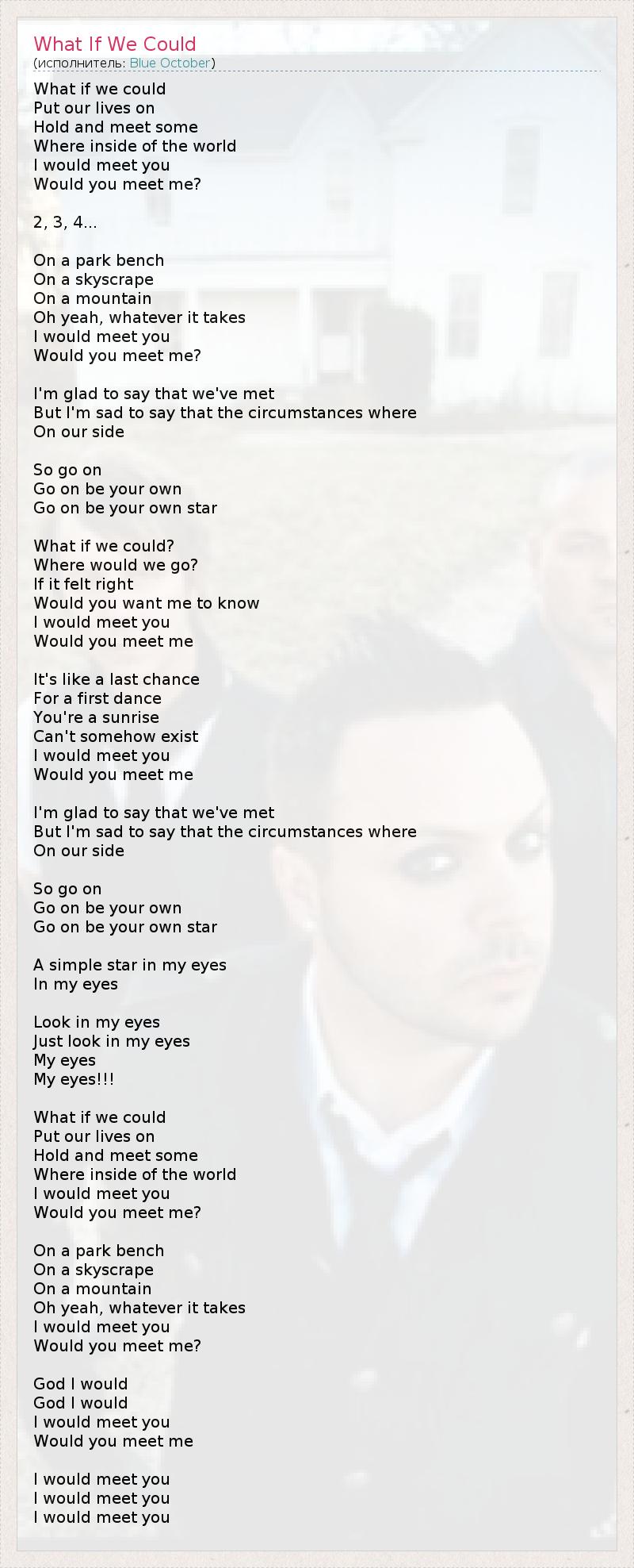 Перевод песни Blue October - What If We Could What If We Could Что, если бы мы могли Что, если бы мы могли Строить наши жизни Обнимать и встречать кого-то Там внутри мира Я бы встретил тебя А ты бы встретила меня? 2, 3, 4... На скамье в парке На крыше небоскреба На горе О да, неважно где Я бы встретил тебя А ты бы встретила меня? Я рад сказать, что мы встретились Но мне грустно говорить, что обстоятельства не были На нашей стороне Так продолжай Продолжай быть своей Продолжай быть своей собственной звездой Что, если бы мы могли? Куда мы бы мы пошли? Если всё было бы хорошо Хотела бы ты, чтобы я знал Я бы встретил тебя А ты бы встретила меня? Это похоже на последний шанс Для первого танца Ты – утренняя заря Этого как будто бы не может быть Я бы встретил тебя А ты бы встретила меня? Я рад сказать, что мы встретились Но мне грустно говорить, что обстоятельства не были На нашей стороне Так продолжай Продолжай быть своей Продолжай быть своей собственной звездой Суперзвезда в моих глазах В моих глазах Смотри в мои глаза Просто смотри в мои глаза Мои глаза Мои глаза!!! Что, если бы мы могли Строить наши жизни Обнимать и встречать кого-то Там внутри мира Я бы встретил тебя А ты бы встретила меня? На скамье в парке На крыше небоскреба На горе О да, неважно где Я бы встретил тебя Ты бы встретила меня? Боже, я бы Боже, я бы Я бы встретил тебя А ты бы встретила меня? Я бы встретил тебя Я бы встретил тебя Я бы встретил тебя