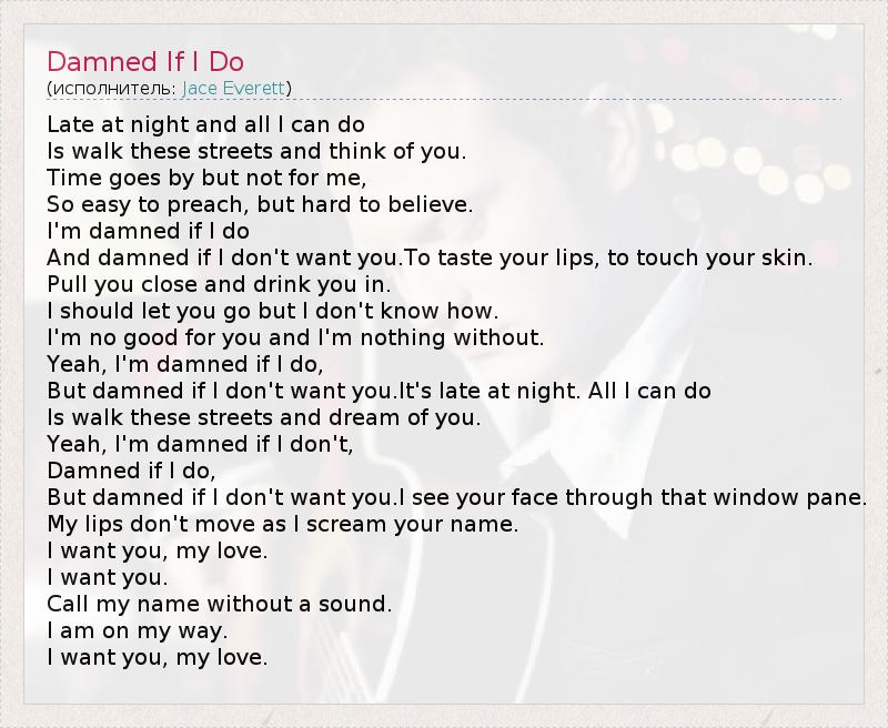 Late at night and all I can do Is walk these streets and think of you. Time goes by but not for me, So easy to preach, but hard to believe. I'm damned if I do And damned if I don't want you.To taste your lips, to touch your skin. Pull you close and drink you in. I should let you go but I don't know how. I'm no good for you and I'm nothing without. Yeah, I'm damned if I do, But damned if I don't want you.It's late at night. All I can do Is walk these streets and dream of you. Yeah, I'm damned if I don't, Damned if I do, But damned if I don't want you.I see your face through that window pane. My lips don't move as I scream your name. I want you, my love. I want you. Call my name without a sound. I am on my way. I want you, my love.