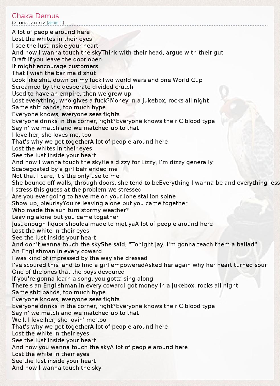 A lot of people around here Lost the whites in their eyes I see the lust inside your heart And now I wanna touch the skyThink with their head, argue with their gut Draft if you leave the door open It might encourage customers That I wish the bar maid shut Look like shit, down on my luckTwo world wars and one World Cup Screamed by the desperate divided crutch Used to have an empire, then we grew up Lost everything, who gives a fuck?Money in a jukebox, rocks all night Same shit bands, too much hype Everyone knows, everyone sees fights Everyone drinks in the corner, right?Everyone knows their C blood type Sayin' we match and we matched up to that I love her, she loves me, too That's why we get togetherA lot of people around here Lost the whites in their eyes See the lust inside your heart And now I wanna touch the skyHe's dizzy for Lizzy, I'm dizzy generally Scapegoated by a girl befriended me Not that I care, it's the only use to me She bounce off walls, through doors, she tend to beEverything I wanna be and everything less I stress this guess at the problem we stressed Are you ever going to have me on your lone stallion spine Show up, pleurisyYou're leaving alone but you came together Who made the sun turn stormy weather? Leaving alone but you came together Just enough liquor shoulda made to met yaA lot of people around here Lost the white in their eyes See the lust inside your heart And don't wanna touch the skyShe said, "Tonight Jay, I'm gonna teach them a ballad" An Englishman in every coward I was kind of impressed by the way she dressed I've scoured this land to find a girl empoweredAsked her again why her heart turned sour One of the ones that the boys devoured If you're gonna learn a song, you gotta sing along There's an Englishman in every cowardI got money in a jukebox, rocks all night Same shit bands, too much hype Everyone knows, everyone sees fights Everyone drinks in the corner, right?Everyone knows their C blood type Sayin' we match and we matched up to that Well, I love her, she lovin' me too That's why we get togetherA lot of people around here Lost the white in their eyes See the lust inside your heart And now you wanna touch the skyA lot of people around here Lost the white in their eyes See the lust inside your heart And now I wanna touch the sky