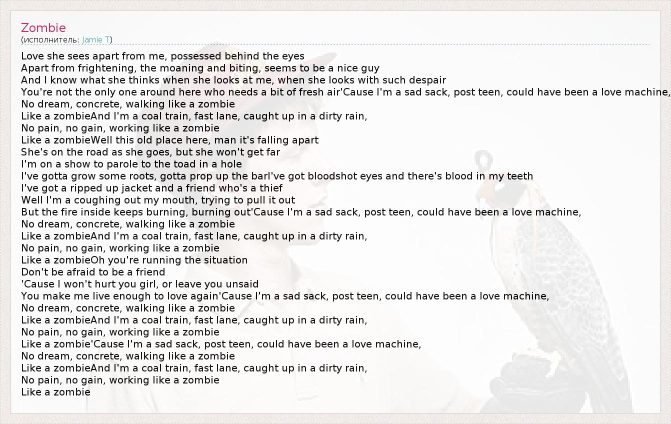 Like a zombieAnd I'm a coal train, fast lane, caught up in a dirty rain,