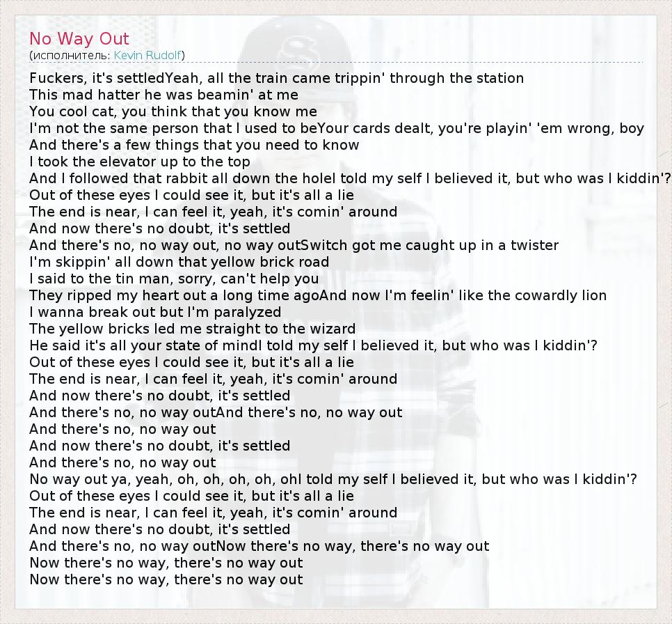 Fuckers, it's settledYeah, all the train came trippin' through the station This mad hatter he was beamin' at me You cool cat, you think that you know me I'm not the same person that I used to beYour cards dealt, you're playin' 'em wrong, boy And there's a few things that you need to know I took the elevator up to the top And I followed that rabbit all down the holeI told my self I believed it, but who was I kiddin'? Out of these eyes I could see it, but it's all a lie The end is near, I can feel it, yeah, it's comin' around And now there's no doubt, it's settled And there's no, no way out, no way outSwitch got me caught up in a twister I'm skippin' all down that yellow brick road I said to the tin man, sorry, can't help you They ripped my heart out a long time agoAnd now I'm feelin' like the cowardly lion I wanna break out but I'm paralyzed The yellow bricks led me straight to the wizard He said it's all your state of mindI told my self I believed it, but who was I kiddin'? Out of these eyes I could see it, but it's all a lie The end is near, I can feel it, yeah, it's comin' around And now there's no doubt, it's settled And there's no, no way outAnd there's no, no way out And there's no, no way out And now there's no doubt, it's settled And there's no, no way out No way out ya, yeah, oh, oh, oh, oh, ohI told my self I believed it, but who was I kiddin'? Out of these eyes I could see it, but it's all a lie The end is near, I can feel it, yeah, it's comin' around And now there's no doubt, it's settled And there's no, no way outNow there's no way, there's no way out Now there's no way, there's no way out Now there's no way, there's no way out
