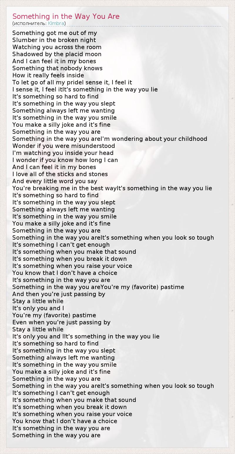 Something got me out of my Slumber in the broken night Watching you across the room Shadowed by the placid moon And I can feel it in my bones Something that nobody knows How it really feels inside To let go of all my prideI sense it, I feel it I sense it, I feel itIt's something in the way you lie It's something so hard to find It's something in the way you slept Something always left me wanting It's something in the way you smile You make a silly joke and it's fine Something in the way you are Something in the way you areI'm wondering about your childhood Wonder if you were misunderstood I'm watching you inside your head I wonder if you know how long I can And I can feel it in my bones I love all of the sticks and stones And every little word you say You're breaking me in the best wayIt's something in the way you lie It's something so hard to find It's something in the way you slept Something always left me wanting It's something in the way you smile You make a silly joke and it's fine Something in the way you are Something in the way you areIt's something when you look so tough It's something I can't get enough It's something when you make that sound It's something when you break it down It's something when you raise your voice You know that I don't have a choice It's something in the way you are Something in the way you areYou're my (favorite) pastime And then you're just passing by Stay a little while It's only you and I You're my (favorite) pastime Even when you're just passing by Stay a little while It's only you and IIt's something in the way you lie It's something so hard to find It's something in the way you slept Something always left me wanting It's something in the way you smile You make a silly joke and it's fine Something in the way you are Something in the way you areIt's something when you look so tough It's something I can't get enough It's something when you make that sound It's something when you break it down It's something when you raise your voice You know that I don't have a choice It's something in the way you are Something in the way you are