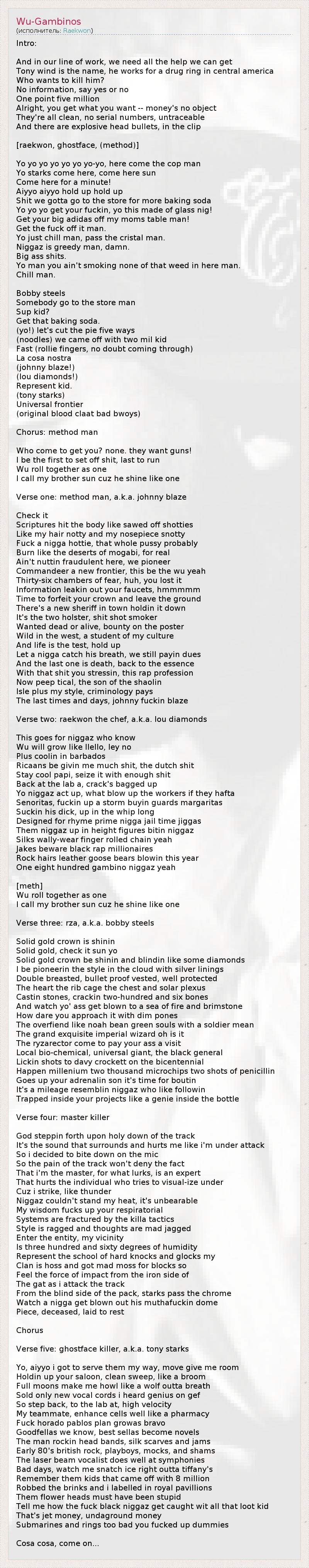 Отдельного вимания достоин трек «Wu-Gambinos» где в 5 с половиной минутах изложена главная тема альбома, потрясающий припев Method Man’а, простой, но необыкновенно завораживающий - надолго застревает в голове, и порой звучит по нескольку дней после прослушивания трека. Совершенство трека дополняет куплет Masta Killa, чьего голоса так нахватало на «Enter The Wu-Tang».