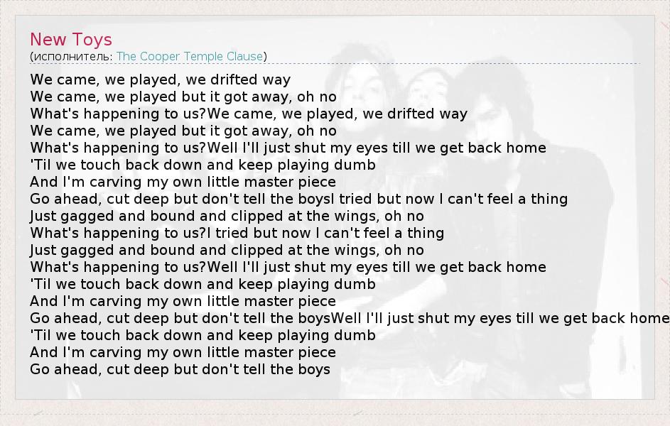 We came, we played, we drifted way We came, we played but it got away, oh no What's happening to us?We came, we played, we drifted way We came, we played but it got away, oh no What's happening to us?Well I'll just shut my eyes till we get back home 'Til we touch back down and keep playing dumb And I'm carving my own little master piece Go ahead, cut deep but don't tell the boysI tried but now I can't feel a thing Just gagged and bound and clipped at the wings, oh no What's happening to us?I tried but now I can't feel a thing Just gagged and bound and clipped at the wings, oh no What's happening to us?Well I'll just shut my eyes till we get back home 'Til we touch back down and keep playing dumb And I'm carving my own little master piece Go ahead, cut deep but don't tell the boysWell I'll just shut my eyes till we get back home 'Til we touch back down and keep playing dumb And I'm carving my own little master piece Go ahead, cut deep but don't tell the boys