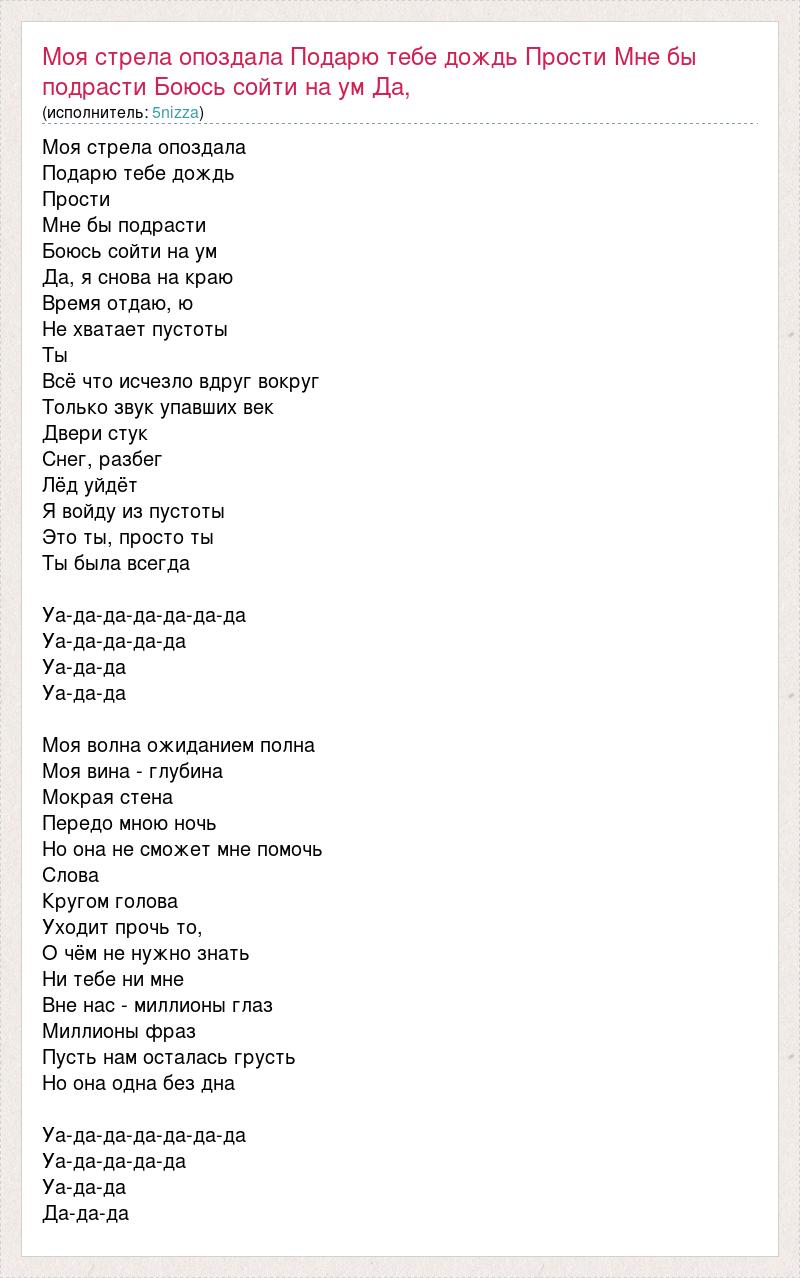 Моя стрела опоздала Подарю тебе дождь Прости Мне бы подрасти Боюсь сойти на ум Да, я снова на краю Время отдаю, ю Не хватает пустоты Ты Всё что исчезло вдруг вокруг Только звук упавших век Двери стук Снег, разбег Лёд уйдёт Я войду из пустоты Это ты, просто ты Ты была всегда Уа-да-да-да-да-да-да Уа-да-да-да-да Уа-да-да Уа-да-да Моя волна ожиданием полна Моя вина - глубина Мокрая стена Передо мною ночь Но она не сможет мне помочь Слова Кругом голова Уходит прочь то, О чём не нужно знать Ни тебе ни мне Вне нас - миллионы глаз Миллионы фраз Пусть нам осталась грусть Но она одна без дна Уа-да-да-да-да-да-да Уа-да-да-да-да Уа-да-да Да-да-да