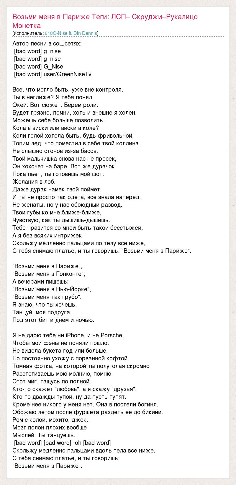 Автор песни в соц.сетях: [bad word] g_nise [bad word] g_nise [bad word] G_Nise [bad word] user/GreenNiseTv Все, что могло быть, уже вне контроля. Ты в неглиже? Я тебя понял. Окей. Вот сюжет. Берем роли: Будет грязно, помни, хоть и внешне я холен. Можешь себе больше позволить. Кола в виски или виски в коле? Коли голой хотела быть, будь фривольной, Топим лед, что поместил в себе твой коллинз. Не слышно стонов из-за басов. Твой мальчишка снова нас не просек, Он хохочет на баре. Вот же дурачок Пока пьет, ты готовишь мой шот. Желания в лоб. Даже дурак намек твой поймет. И ты не просто так одета, все знала наперед. Не женаты, но у нас обоюдный развод. Твои губы ко мне ближе-ближе, Чувствую, как ты дышишь-дышишь. Тебе нравится со мной быть такой бесстыжей, А я без всяких интрижек Скольжу медленно пальцами по телу все ниже, С тебя снимаю платье, и ты говоришь: "Возьми меня в Париже". "Возьми меня в Париже", "Возьми меня в Гонконге", А вечерами пишешь: "Возьми меня в Нью-Йорке", "Возьми меня так грубо". Я знаю, что ты хочешь. Танцуй, моя подруга Под этот бит и днем и ночью. Я не дарю тебе ни iPhone, и не Porsche, Чтобы мои фэны не поняли пошло. Не видела букета год или больше, Но постоянно ухожу с порванной кофтой. Томная фотка, на которой ты полуголая скромно Расстегиваешь мою молнию, помню Этот миг, тащусь по полной. Кто-то скажет "любовь", а я скажу "друзья". Кто-то дважды тупой, ну да пусть тупят. Кроме нее никого у меня нет. Она в постели богиня. Обожаю летом после фуршета раздеть ее до бикини. Ром с колой, мохито, джек. Мозг полон плохих вообще Мыслей. Ты танцуешь. [bad word] [bad word] oh [bad word] Скольжу медленно пальцами вдоль тела все ниже. С тебя снимаю платье, и ты говоришь: "Возьми меня в Париже".