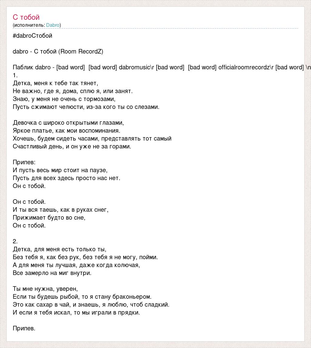 #dabroСтобой dabro - С тобой (Room RecordZ) Паблик dabro - [bad word] [bad word] dabromusic [bad word] [bad word] officialroomrecordz [bad word] 1. Детка, меня к тебе так тянет, Не важно, где я, дома, сплю я, или занят. Знаю, у меня не очень с тормозами, Пусть сжимают челюсти, из-за кого ты со слезами. Девочка с широко открытыми глазами, Яркое платье, как мои воспоминания. Хочешь, будем сидеть часами, представлять тот самый Счастливый день, и он уже не за горами. Припев: И пусть весь мир стоит на паузе, Пусть для всех здесь просто нас нет. Он с тобой. Он с тобой. И ты вся таешь, как в руках снег, Прижимает будто во сне, Он с тобой. 2. Детка, для меня есть только ты, Без тебя я, как без рук, без тебя я не могу, пойми. А для меня ты лучшая, даже когда колючая, Все замерло на миг внутри. Ты мне нужна, уверен, Если ты будешь рыбой, то я стану браконьером. Это как сахар в чай, и знаешь, я люблю, чтоб сладкий. И если я тебя искал, то мы играли в прядки. Припев.