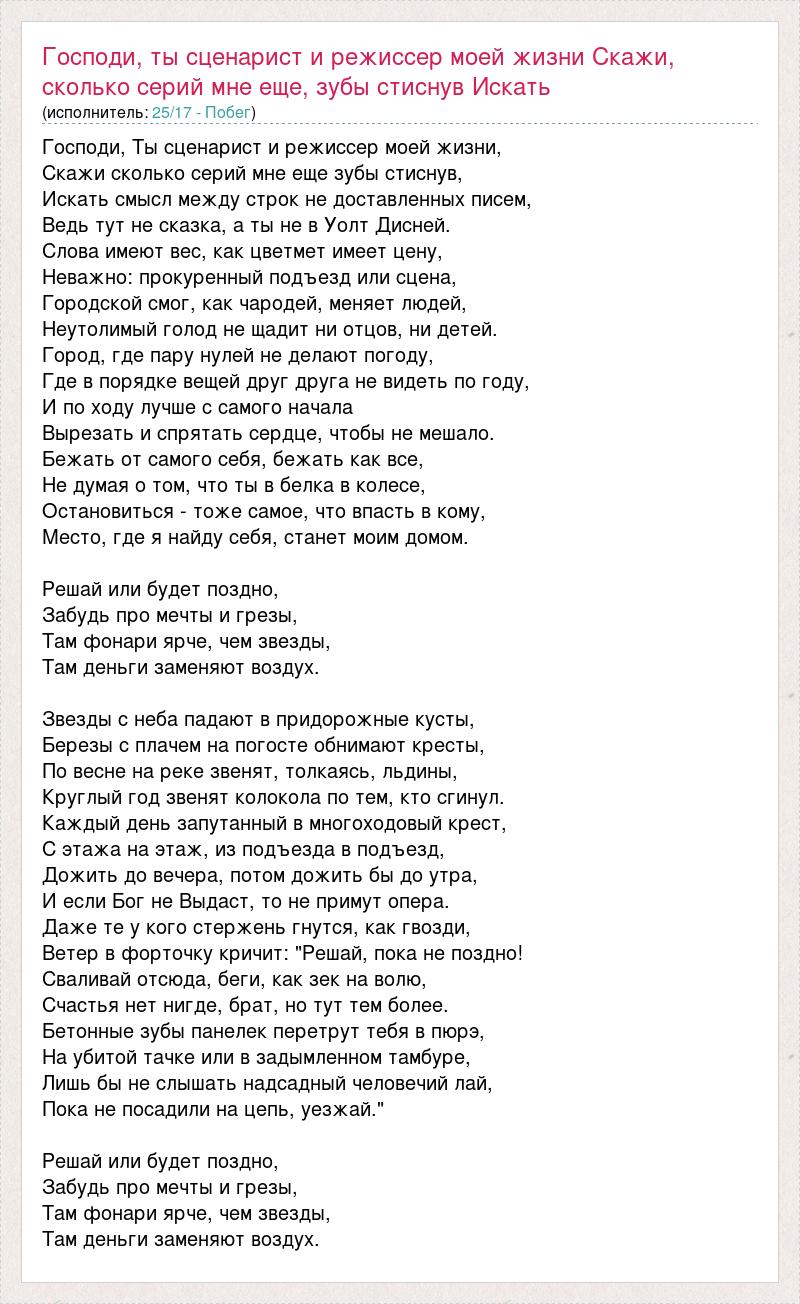 Господи, Ты сценарист и режиссер моей жизни, Скажи сколько серий мне еще зубы стиснув, Искать смысл между строк не доставленных писем, Ведь тут не сказка, а ты не в Уолт Дисней. Слова имеют вес, как цветмет имеет цену, Неважно: прокуренный подъезд или сцена, Городской смог, как чародей, меняет людей, Неутолимый голод не щадит ни отцов, ни детей. Город, где пару нулей не делают погоду, Где в порядке вещей друг друга не видеть по году, И по ходу лучше с самого начала Вырезать и спрятать сердце, чтобы не мешало. Бежать от самого себя, бежать как все, Не думая о том, что ты в белка в колесе, Остановиться - тоже самое, что впасть в кому, Место, где я найду себя, станет моим домом. Решай или будет поздно, Забудь про мечты и грезы, Там фонари ярче, чем звезды, Там деньги заменяют воздух. Звезды с неба падают в придорожные кусты, Березы с плачем на погосте обнимают кресты, По весне на реке звенят, толкаясь, льдины, Круглый год звенят колокола по тем, кто сгинул. Каждый день запутанный в многоходовый крест, С этажа на этаж, из подъезда в подъезд, Дожить до вечера, потом дожить бы до утра, И если Бог не Выдаст, то не примут опера. Даже те у кого стержень гнутся, как гвозди, Ветер в форточку кричит: "Решай, пока не поздно! Сваливай отсюда, беги, как зек на волю, Счастья нет нигде, брат, но тут тем более. Бетонные зубы панелек перетрут тебя в пюрэ, На убитой тачке или в задымленном тамбуре, Лишь бы не слышать надсадный человечий лай, Пока не посадили на цепь, уезжай." Решай или будет поздно, Забудь про мечты и грезы, Там фонари ярче, чем звезды, Там деньги заменяют воздух.