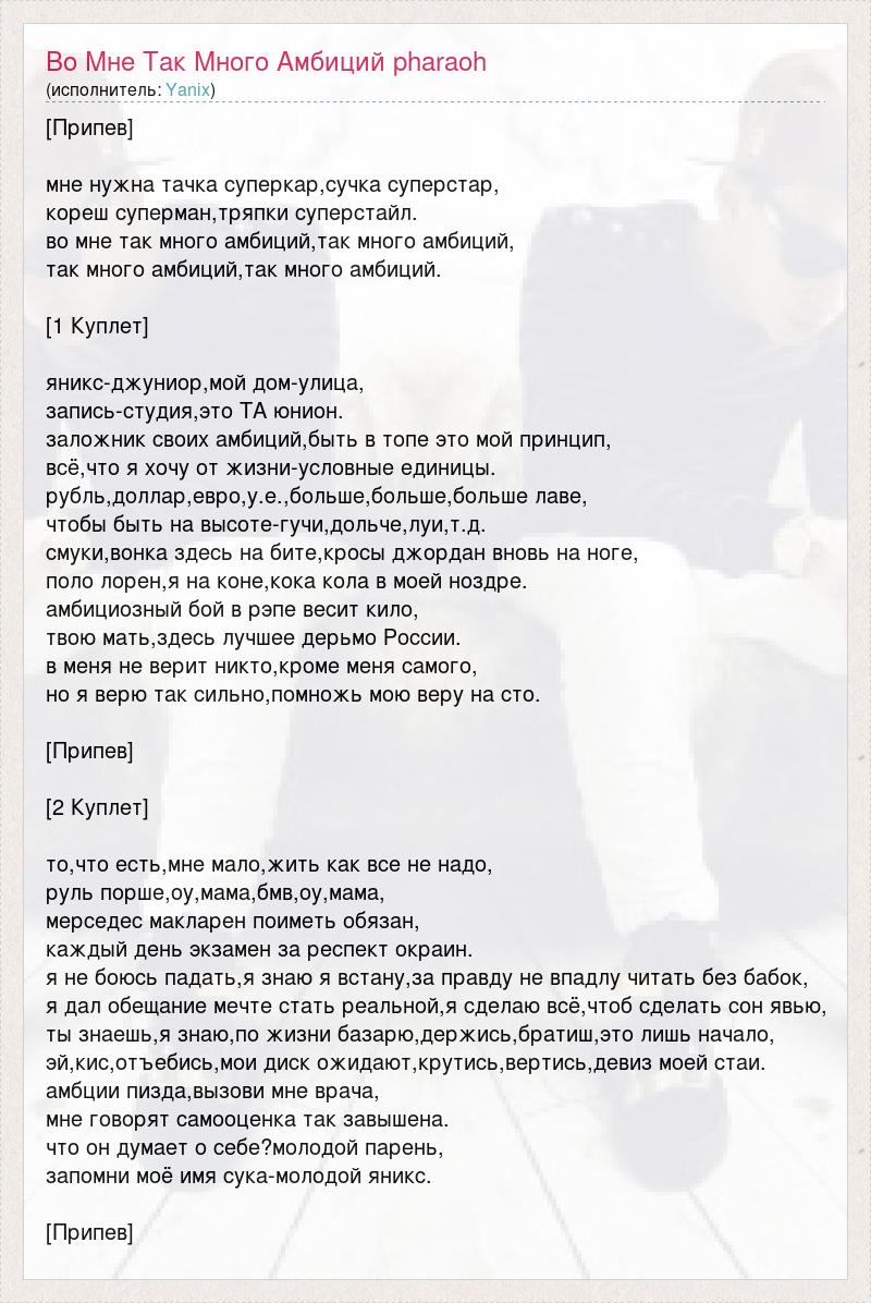 [Припев] мне нужна тачка суперкар,сучка суперстар, кореш суперман,тряпки суперстайл. во мне так много амбиций,так много амбиций, так много амбиций,так много амбиций. [1 Куплет] яникс-джуниор,мой дом-улица, запись-студия,это ТА юнион. заложник своих амбиций,быть в топе это мой принцип, всё,что я хочу от жизни-условные единицы. рубль,доллар,евро,у.е.,больше,больше,больше лаве, чтобы быть на высоте-гучи,дольче,луи,т.д. смуки,вонка здесь на бите,кросы джордан вновь на ноге, поло лорен,я на коне,кока кола в моей ноздре. амбициозный бой в рэпе весит кило, твою мать,здесь лучшее дерьмо России. в меня не верит никто,кроме меня самого, но я верю так сильно,помножь мою веру на сто. [Припев] [2 Куплет] то,что есть,мне мало,жить как все не надо, руль порше,оу,мама,бмв,оу,мама, мерседес макларен поиметь обязан, каждый день экзамен за респект окраин. я не боюсь падать,я знаю я встану,за правду не впадлу читать без бабок, я дал обещание мечте стать реальной,я сделаю всё,чтоб сделать сон явью, ты знаешь,я знаю,по жизни базарю,держись,братиш,это лишь начало, эй,кис,отъебись,мои диск ожидают,крутись,вертись,девиз моей стаи. амбции пизда,вызови мне врача, мне говорят самооценка так завышена. что он думает о себе?молодой парень, запомни моё имя сука-молодой яникс. [Припев]
