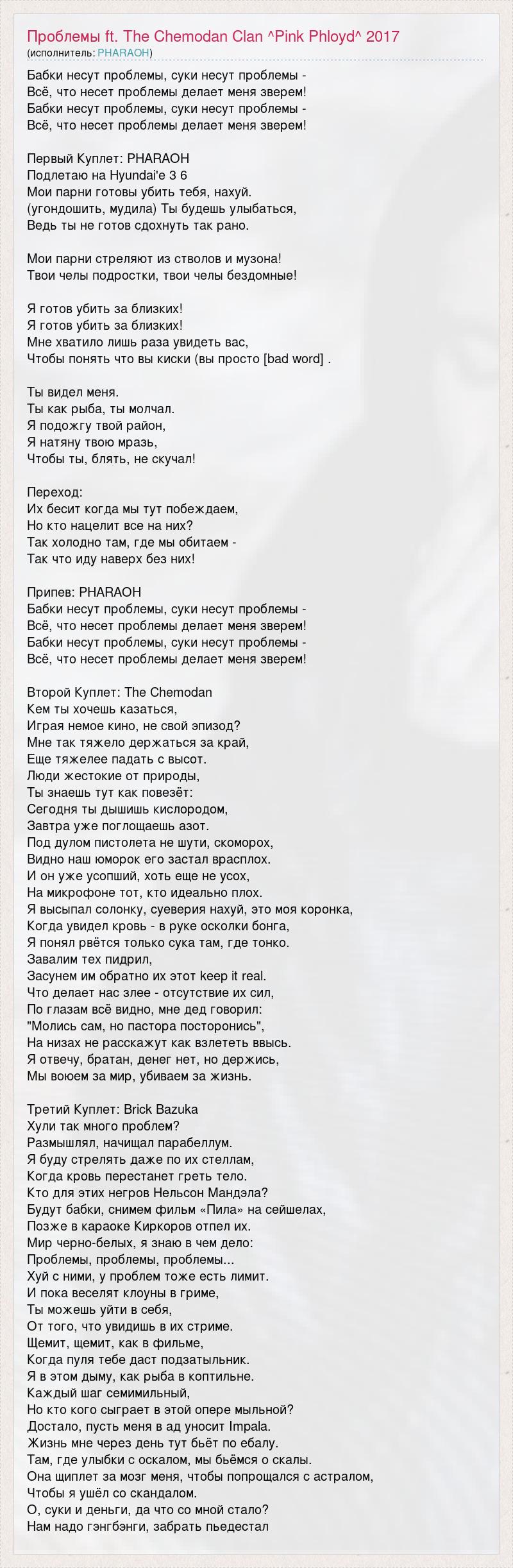 Бабки несут проблемы, суки несут проблемы - Всё, что несет проблемы делает меня зверем! Бабки несут проблемы, суки несут проблемы - Всё, что несет проблемы делает меня зверем! Первый Куплет: PHARAOH Подлетаю на Hyundai'e 3 6 Мои парни готовы убить тебя, нахуй. (угондошить, мудила) Ты будешь улыбаться, Ведь ты не готов сдохнуть так рано. Мои парни стреляют из стволов и музона! Твои челы подростки, твои челы бездомные! Я готов убить за близких! Я готов убить за близких! Мне хватило лишь раза увидеть вас, Чтобы понять что вы киски (вы просто [bad word] . Ты видел меня. Ты как рыба, ты молчал. Я подожгу твой район, Я натяну твою мразь, Чтобы ты, блять, не скучал! Переход: Их бесит когда мы тут побеждаем, Но кто нацелит все на них? Так холодно там, где мы обитаем - Так что иду наверх без них! Припев: PHARAOH Бабки несут проблемы, суки несут проблемы - Всё, что несет проблемы делает меня зверем! Бабки несут проблемы, суки несут проблемы - Всё, что несет проблемы делает меня зверем! Второй Куплет: The Chemodan Кем ты хочешь казаться, Играя немое кино, не свой эпизод? Мне так тяжело держаться за край, Еще тяжелее падать с высот. Люди жестокие от природы, Ты знаешь тут как повезёт: Сегодня ты дышишь кислородом, Завтра уже поглощаешь азот. Под дулом пистолета не шути, скоморох, Видно наш юморок его застал врасплох. И он уже усопший, хоть еще не усох, На микрофоне тот, кто идеально плох. Я высыпал солонку, суеверия нахуй, это моя коронка, Когда увидел кровь - в руке осколки бонга, Я понял рвётся только сука там, где тонко. Завалим тех пидрил, Засунем им обратно их этот keep it real. Что делает нас злее - отсутствие их сил, По глазам всё видно, мне дед говорил: "Молись сам, но пастора посторонись", На низах не расскажут как взлететь ввысь. Я отвечу, братан, денег нет, но держись, Мы воюем за мир, убиваем за жизнь. Третий Куплет: Brick Bazuka Хули так много проблем? Размышлял, начищал парабеллум. Я буду стрелять даже по их стеллам, Когда кровь перестанет греть тело. Кто для этих негров Нельсон Мандэла? Будут бабки, снимем фильм «Пила» на сейшелах, Позже в караоке Киркоров отпел их. Мир черно-белых, я знаю в чем дело: Проблемы, проблемы, проблемы... Хуй с ними, у проблем тоже есть лимит. И пока веселят клоуны в гриме, Ты можешь уйти в себя, От того, что увидишь в их стриме. Щемит, щемит, как в фильме, Когда пуля тебе даст подзатыльник. Я в этом дыму, как рыба в коптильне. Каждый шаг семимильный, Но кто кого сыграет в этой опере мыльной? Достало, пусть меня в ад уносит Impala. Жизнь мне через день тут бьёт по ебалу. Там, где улыбки с оскалом, мы бьёмся о скалы. Она щиплет за мозг меня, чтобы попрощался с астралом, Чтобы я ушёл со скандалом. О, суки и деньги, да что со мной стало? Нам надо гэнгбэнги, забрать пьедестал