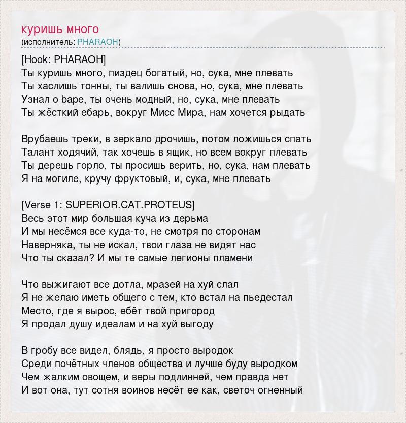 [Hook: PHARAOH] Ты куришь много, пиздец богатый, но, сука, мне плевать Ты хаслишь тонны, ты валишь снова, но, сука, мне плевать Узнал о bape, ты очень модный, но, сука, мне плевать Ты жёсткий ебарь, вокруг Мисс Мира, нам хочется рыдать Врубаешь треки, в зеркало дрочишь, потом ложишься спать Талант ходячий, так хочешь в ящик, но всем вокруг плевать Ты дерешь горло, ты просишь верить, но, сука, нам плевать Я на могиле, кручу фруктовый, и, сука, мне плевать [Verse 1: SUPERIOR.CAT.PROTEUS] Весь этот мир большая куча из дерьма И мы несёмся все куда-то, не смотря по сторонам Наверняка, ты не искал, твои глаза не видят нас Что ты сказал? И мы те самые легионы пламени Что выжигают все дотла, мразей на хуй слал Я не желаю иметь общего с тем, кто встал на пьедестал Место, где я вырос, ебёт твой пригород Я продал душу идеалам и на хуй выгоду В гробу все видел, блядь, я просто выродок Среди почётных членов общества и лучше буду выродком Чем жалким овощем, и веры подлинней, чем правда нет И вот она, тут сотня воинов несёт ее как, светоч огненный