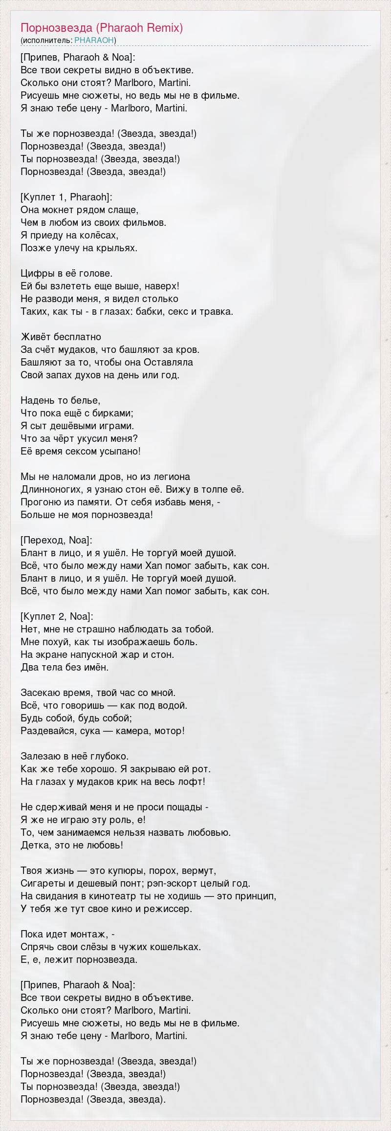 [Припев, Pharaoh & Noa]: Все твои секреты видно в объективе. Сколько они стоят? Marlboro, Martini. Рисуешь мне сюжеты, но ведь мы не в фильме. Я знаю тебе цену - Marlboro, Martini. Ты же порнозвезда! (Звезда, звезда!) Порнозвезда! (Звезда, звезда!) Ты порнозвезда! (Звезда, звезда!) Порнозвезда! (Звезда, звезда!) [Куплет 1, Pharaoh]: Она мокнет рядом слаще, Чем в любом из своих фильмов. Я приеду на колёсах, Позже улечу на крыльях. Цифры в её голове. Ей бы взлететь еще выше, наверх! Не разводи меня, я видел столько Таких, как ты - в глазах: бабки, секс и травка. Живёт бесплатно За счёт мудаков, что башляют за кров. Башляют за то, чтобы она Оставляла Свой запах духов на день или год. Надень то белье, Что пока ещё с бирками; Я сыт дешёвыми играми. Что за чёрт укусил меня? Её время сексом усыпано! Мы не наломали дров, но из легиона Длинноногих, я узнаю стон её. Вижу в толпе её. Прогоню из памяти. От себя избавь меня, - Больше не моя порнозвезда! [Переход, Noa]: Блант в лицо, и я ушёл. Не торгуй моей душой. Всё, что было между нами Xan помог забыть, как сон. Блант в лицо, и я ушёл. Не торгуй моей душой. Всё, что было между нами Xan помог забыть, как сон. [Куплет 2, Noa]: Нет, мне не страшно наблюдать за тобой. Мне похуй, как ты изображаешь боль. На экране напускной жар и стон. Два тела без имён. Засекаю время, твой час со мной. Всё, что говоришь — как под водой. Будь собой, будь собой; Раздевайся, сука — камера, мотор! Залезаю в неё глубоко. Как же тебе хорошо. Я закрываю ей рот. На глазах у мудаков крик на весь лофт! Не сдерживай меня и не проси пощады - Я же не играю эту роль, е! То, чем занимаемся нельзя назвать любовью. Детка, это не любовь! Твоя жизнь — это купюры, порох, вермут, Сигареты и дешевый понт; рэп-эскорт целый год. На свидания в кинотеатр ты не ходишь — это принцип, У тебя же тут свое кино и режиссер. Пока идет монтаж, - Спрячь свои слёзы в чужих кошельках. Е, е, лежит порнозвезда. [Припев, Pharaoh & Noa]: Все твои секреты видно в объективе. Сколько они стоят? Marlboro, Martini. Рисуешь мне сюжеты, но ведь мы не в фильме. Я знаю тебе цену - Marlboro, Martini. Ты же порнозвезда! (Звезда, звезда!) Порнозвезда! (Звезда, звезда!) Ты порнозвезда! (Звезда, звезда!) Порнозвезда! (Звезда, звезда).