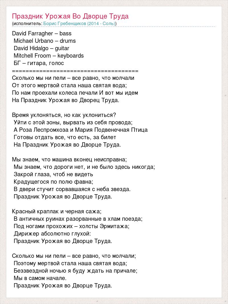 David Farragher – bass Michael Urbano – drums David Hidalgo – guitar Mitchell Froom – keyboards БГ – гитара, голос ===================================== Сколько мы ни пели – все равно, что молчали От этого мертвой стала наша святая вода; По нам проехали колеса печали И вот мы идем На Праздник Урожая во Дворец Труда. Время уклоняться, но как уклониться? Уйти с этой зоны, вырвать из себя провода; А Роза Леспромхоза и Мария Подвенечная Птица Готовы отдать все, что есть, за билет На Праздник Урожая во Дворце Труда. Мы знаем, что машина вконец неисправна; Мы знаем, что дороги нет, и не было здесь никогда; Закрой глаза, чтоб не видеть Крадущегося по полю фавна; В двери стучит сорвавшаяся с неба звезда. Праздник Урожая во Дворце Труда. Красный краплак и черная сажа; В античных руинах разорванные в хлам поезда; Под ногами прохожих – холсты Эрмитажа; Дирижер абсолютно глухой: Праздник Урожая во Дворце Труда. Сколько мы ни пели – все равно, что молчали; Поэтому мертвой стала наша святая вода; Беззвездной ночью я буду ждать на причале; Мы в самом начале. Праздник Урожая во Дворце Труда.
