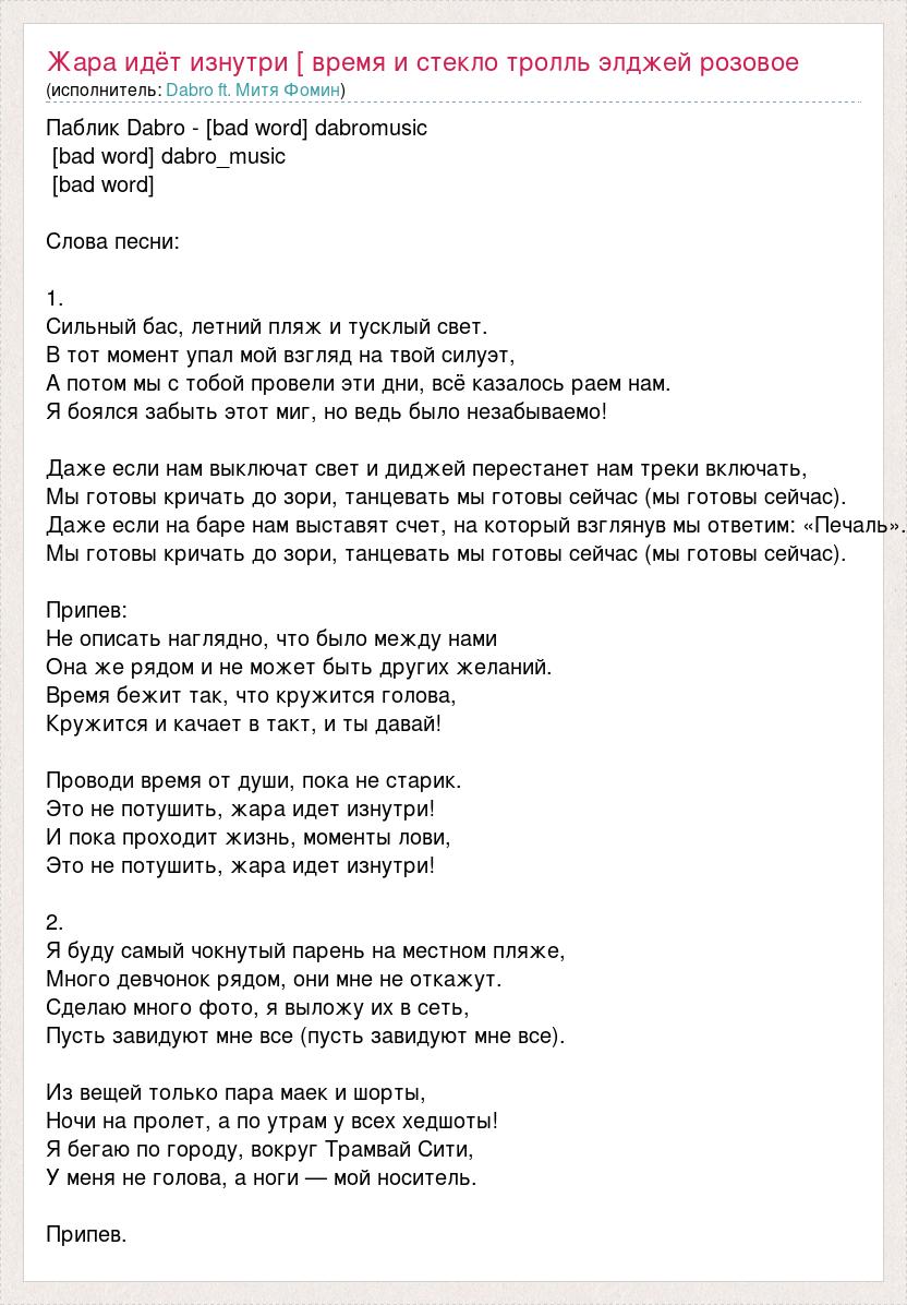 Паблик Dabro - [bad word] dabromusic [bad word] dabro_music [bad word] Слова песни: 1. Сильный бас, летний пляж и тусклый свет. В тот момент упал мой взгляд на твой силуэт, А потом мы с тобой провели эти дни, всё казалось раем нам. Я боялся забыть этот миг, но ведь было незабываемо! Даже если нам выключат свет и диджей перестанет нам треки включать, Мы готовы кричать до зори, танцевать мы готовы сейчас (мы готовы сейчас). Даже если на баре нам выставят счет, на который взглянув мы ответим: «Печаль». Мы готовы кричать до зори, танцевать мы готовы сейчас (мы готовы сейчас). Припев: Не описать наглядно, что было между нами Она же рядом и не может быть других желаний. Время бежит так, что кружится голова, Кружится и качает в такт, и ты давай! Проводи время от души, пока не старик. Это не потушить, жара идет изнутри! И пока проходит жизнь, моменты лови, Это не потушить, жара идет изнутри! 2. Я буду самый чокнутый парень на местном пляже, Много девчонок рядом, они мне не откажут. Сделаю много фото, я выложу их в сеть, Пусть завидуют мне все (пусть завидуют мне все). Из вещей только пара маек и шорты, Ночи на пролет, а по утрам у всех хедшоты! Я бегаю по городу, вокруг Трамвай Сити, У меня не голова, а ноги — мой носитель. Припев.